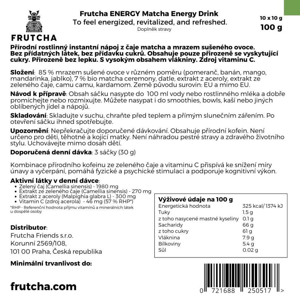 !!! AKTUÁLNĚ MÁME VYPRODANÉ BALENÍ V KRABIČCE, PO OBJEDNÁNÍ ODEŠLEME 10 SAMOSTATNÝCH SÁČKŮ FRUTCHA ENERGY + LAHVIČKU.