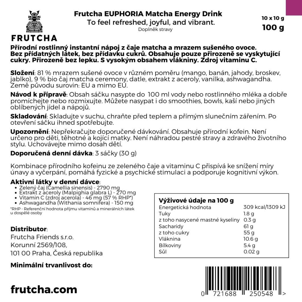 Zažij energii a radost s Frutcha Euphoria! Nejlepší způsob, jak objevit čistou energii z přírody. Jen matcha, ovoce a adaptogeny.